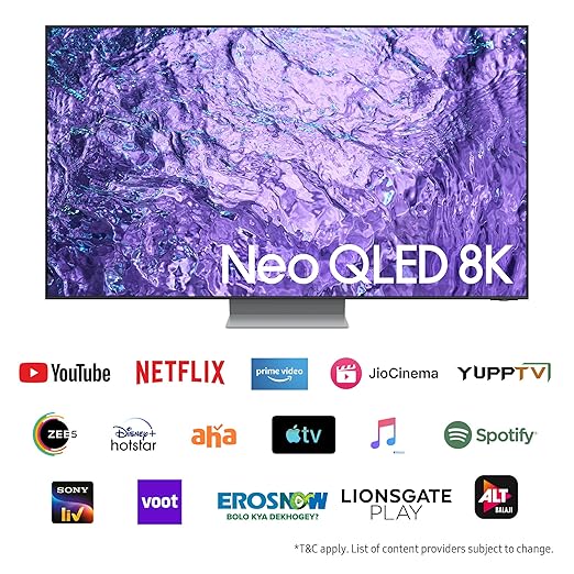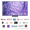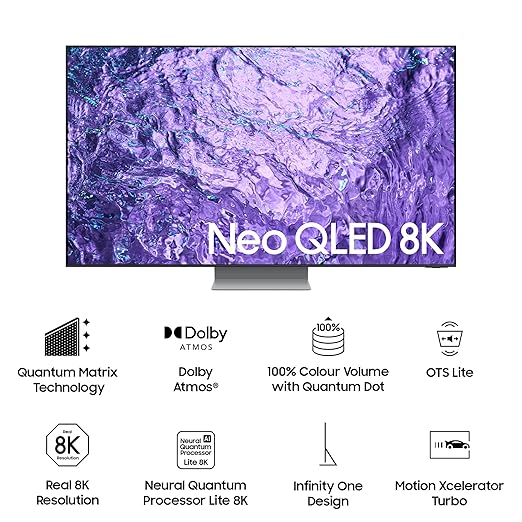 - Display : 8K Ultra HD Smart Neo QLED Panel | Neural Quantum Processor Lite 8K | 100% Colour Volume with Quantum Dot | Neo Quantum HDR 8K | Quantum Matrix Technology | Wide Viewing Angle | Ultimate 8K Dimming Pro | 4 Bezel-less | AI Upscale | Auto HDR Remastering | Motion Xcelerator Turbo | Real Depth Enhancer | Filmmaker Mode